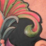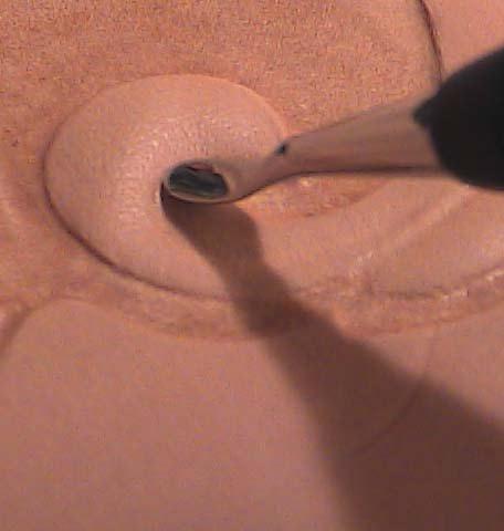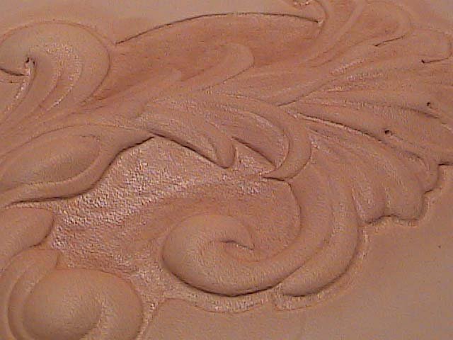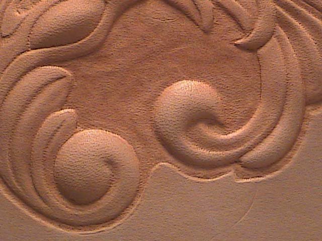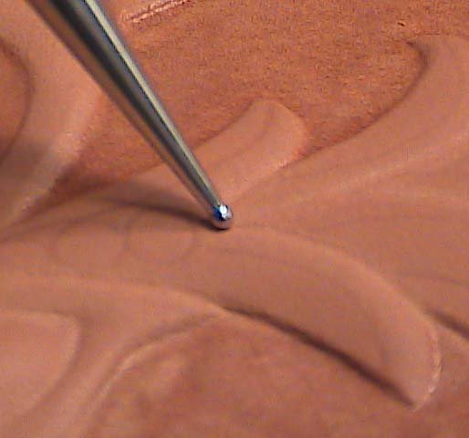 - Now work the leather from the flesh side to raise areas from the back to give it volume. Hold the leather in one hand with the flesh side up which acts as a cushion. Using the ball-end modeler , work the leather from the flesh side by pressing firmly with the ball modelers while sliding it along the lines of the design. Use the modelers with different balls-tip sizes depending on the areas that need to be worked and the level of relief wanted.