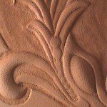 Repoussé is done on vegetable-tanned leather. The most suitable type is calfskin, especially 3-4oz (3/64 – 1/16th inch) thick pieces, although some artist prefer thicknesses greater 5oz (5/64th inch).