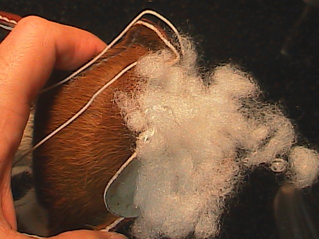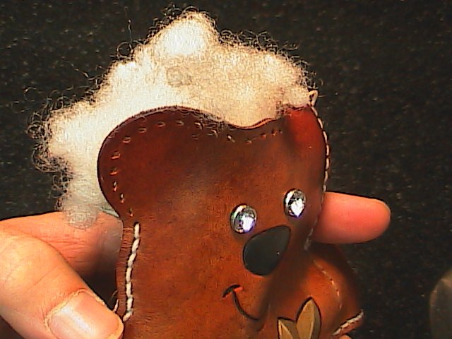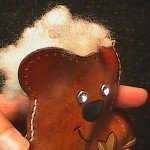With the front and back pieces now joined, use the awl to make your stitching holes. I find that an easy way to do this is to lay the bear down on a poundo board face up, and keeping the awl straight up and down press down through both layers of leathers. After all the stitching holes are complete, I place the bear into the stitching pony to stitch together from ear to ear using the saddle stitch technique. Once you have stitched around to the other ear, remove the bear from the stitching pony.