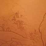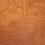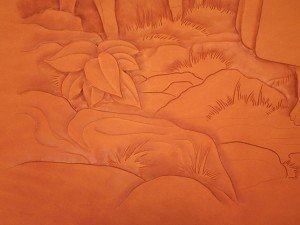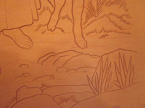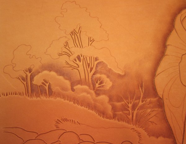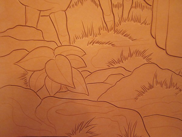 With all the swivel knife work done, I decided to start with the background areas first and work my way toward the foreground. I started beveling with a F900 figure carving matting tool to push the background areas down.