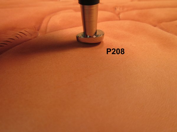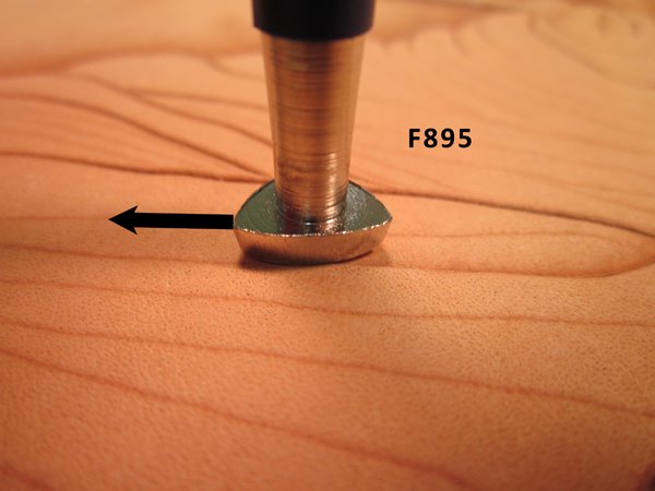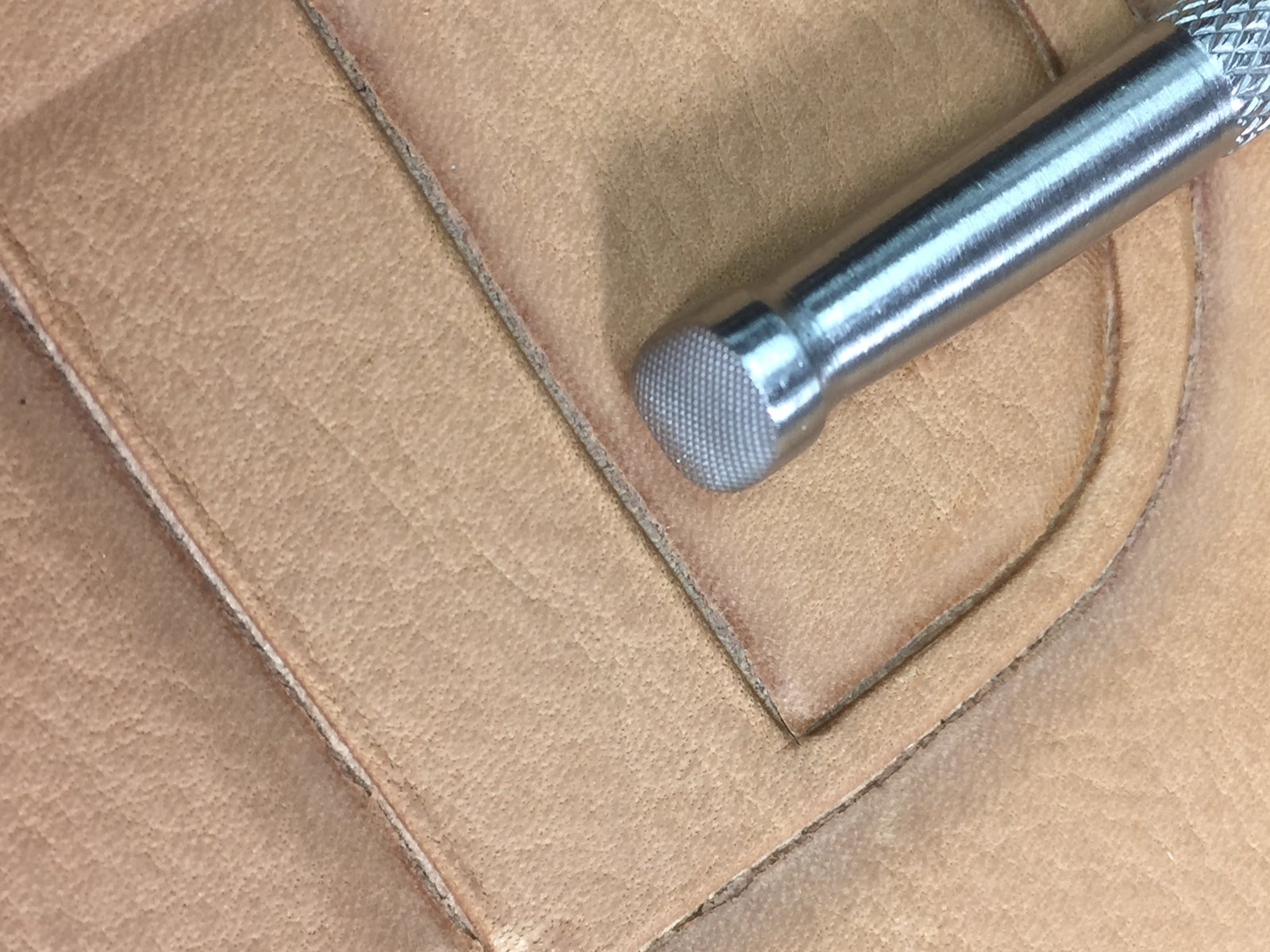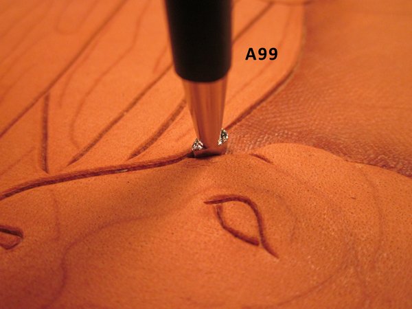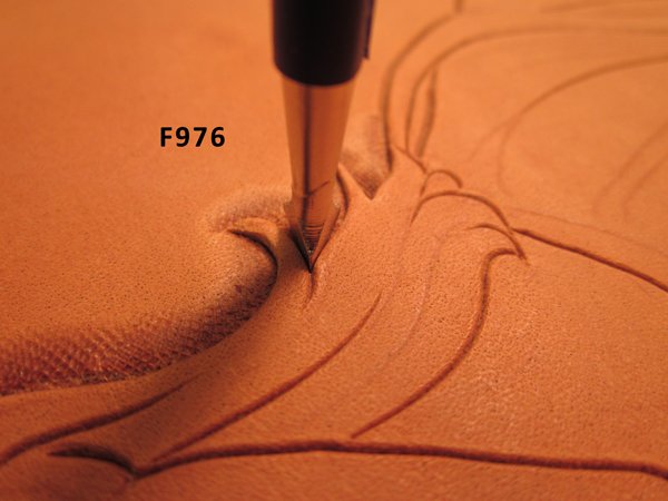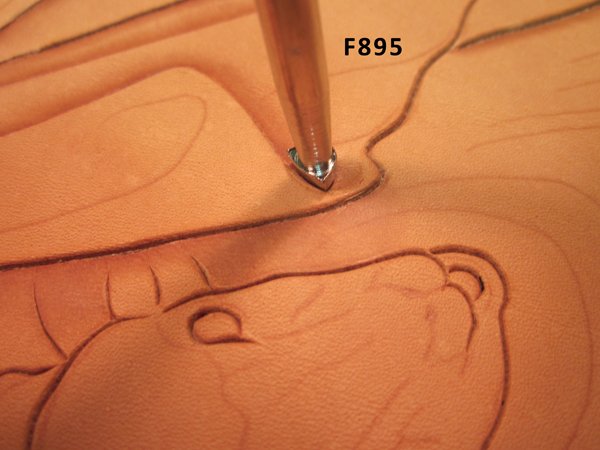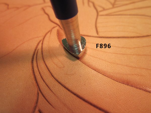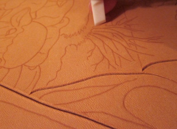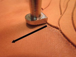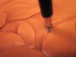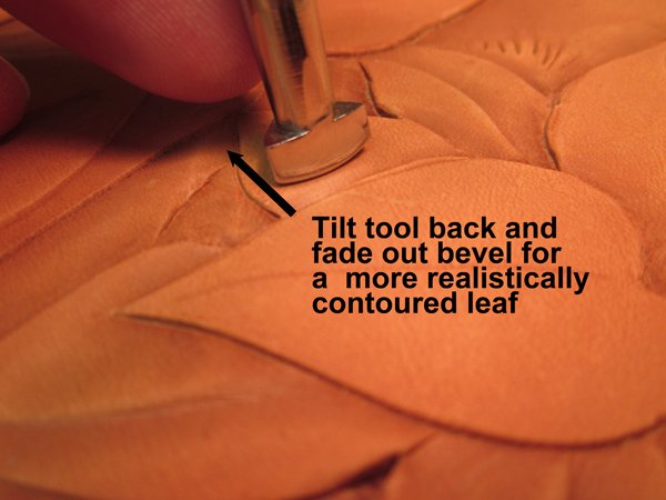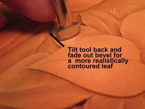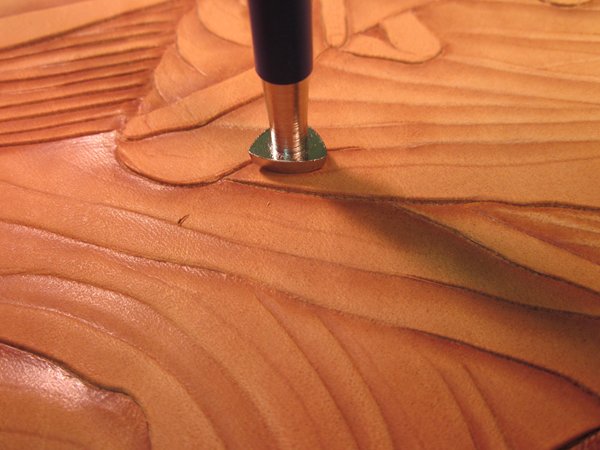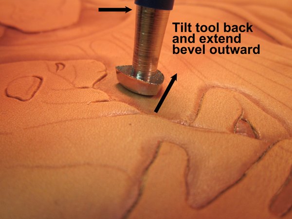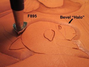 Here I am continuing to rough bevel the last of the cut lines. As you can see the rough beveling leaves a “halo” around the beveled object. To eliminate this “halo” effect, all that is needed is to tilt the figure beveler back so none of the edges are in contact with the leather. The tilting back of the figure beveler switches the tool into a smooth matting tool. Using the tool in this way to mat down the bevel will eliminate and/or reduce the “halo” for a more realistic look.