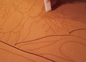 - Center the tracing on the damp leather. Transfer the design to the leather using the stylus. Push just hard enough to make a clear impression.