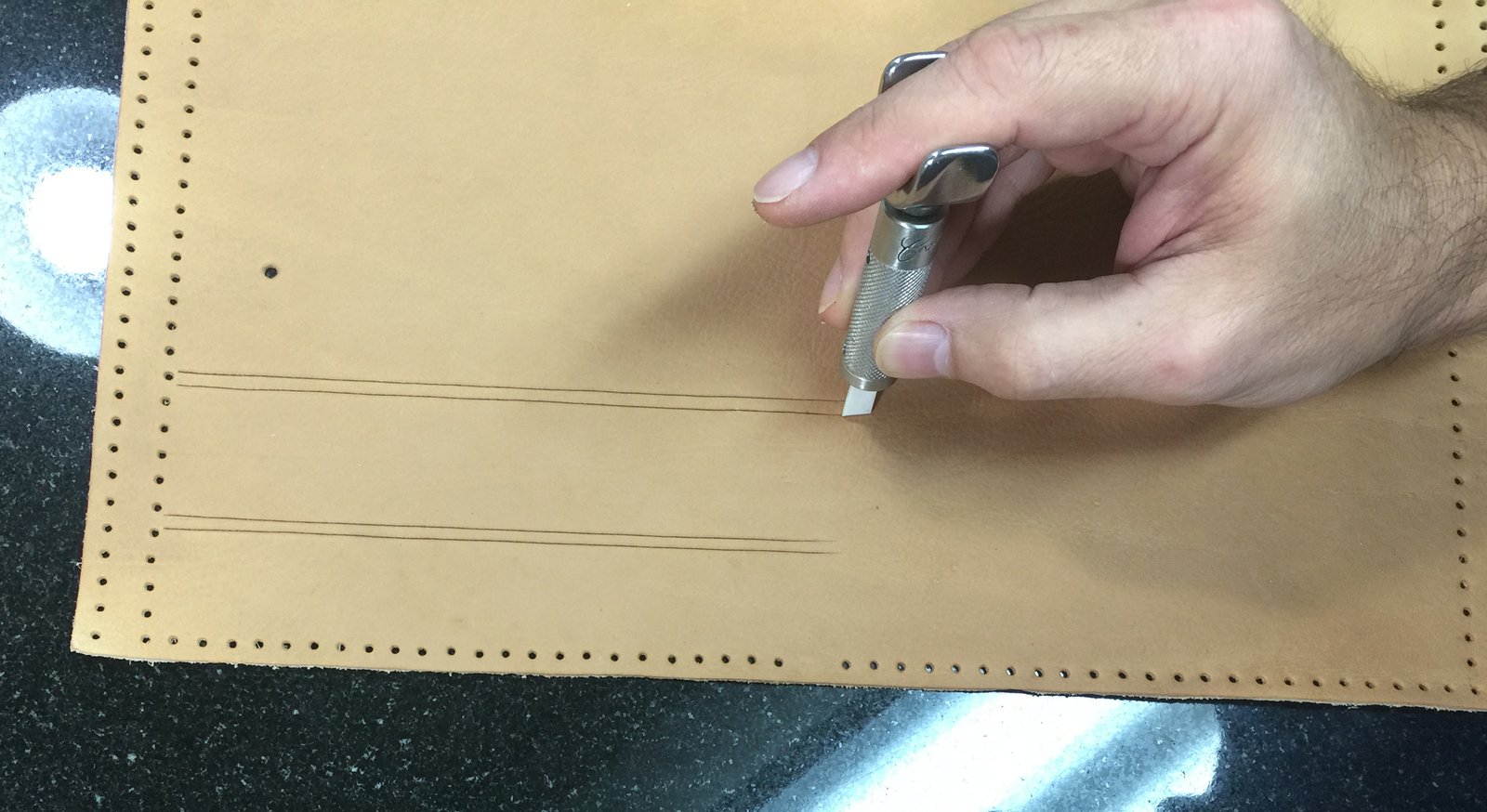 1. To begin, cut lines for the decorative column using a swivel knife. These 4 cuts will run parallel to the left side of the front of the purse and will be approximately 6.5 inches in length. It is recommended to use a stainless steel ruler to ensure straight cuts.