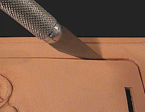 - Use the filigree blade to cut the line opening for the window. Do not cut all the way through; you can use the craft knife to finish the cut after you have finished tooling.