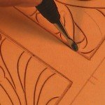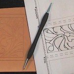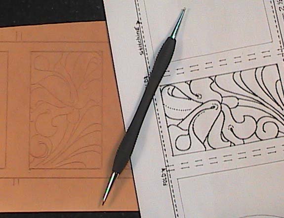 Make a tracing of the case pattern on a sheet of tracing film that is at least ½” larger than the case design itself. Cut the leather the same size as the tracing film. Dampen the entire surface of the leather on the grain side. Place the tracing film over the leather and fasten with tacks or tape to your work surface. Trace the design with a stylus or modeling tool using a ruler to assist in all straight lines (Fig. 1).