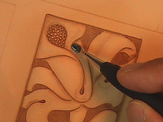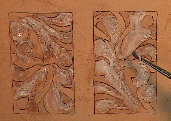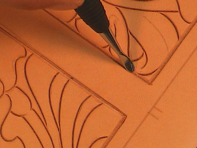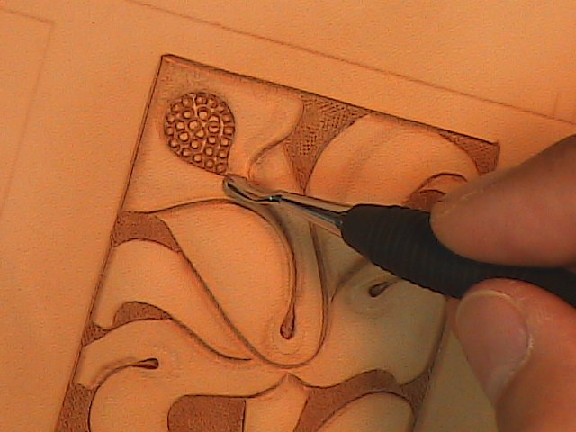 Using a rounded modeling spoon lightly bevel the swivel knife cuts starting with the borders (Fig. 3).