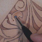 At this stage, turn the leather over to the flesh side. The background areas and the outlines of the design should be visible. If any of the outlines are not visible, re-bevel that area with the rounded modeler. Once all the lines are visible on the flesh side, take an ink pen and trace the burnished lines of the pattern, this will help on the next step of “Repoussé” or embossing. Now using the ball modeler tool in one hand, and the leather (grain side up) in my other hand I started pressing down on the leather making sure to stay inside the pen lines (Fig. 5).