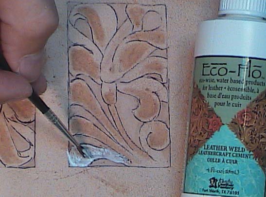 After all the raising work is done with the ball modeler, I “painted” on Leather Weld glue onto all the areas that were raised and let dry thoroughly (In hind sight I would have mixed dryer lint with the glue to make a better plug) (Fig. 6 & 7).
