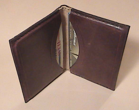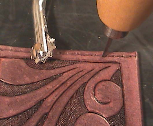 After the glue has dried, lightly re-dampen the grain side of the leather. Using the rounded modeler I re-beveled, and rounded off all the cut lines (Fig. 8 & 9).