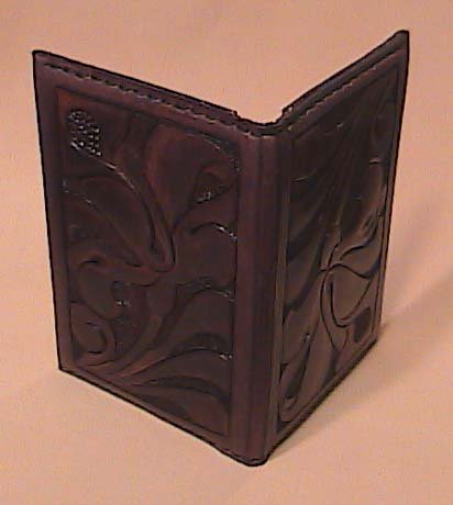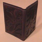 While the leather is still lightly damp, I applied Eco-Flo Mahogany Antique Gel to both sides. I apply the stains while the leather is still damp to eliminate the streaking that sometimes happens when stains are applied to dry leather. While still damp, take a bone folder along the fold lines of the pattern on the flesh side of the leather. Allow to dry, apply sealer and let dry again (Fig. 10).