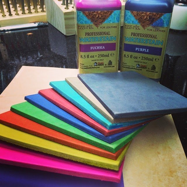 Eco-Flo Cova Colors – These acrylic paints were developed specifically for leather. Whereas the other products listed soak in to the leather, acrylic paint sits on top of the leather. They are opaque, however can be thinned with water to reduce intensity which can be used as a “wash” to tint areas.