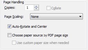 Please note if you are having problems with print size: When printing on a home printer, use the settings seen on the image to the right in the Page Handling area of the Adobe Reader print dialogue box. If your printer is cutting edges off, set “Page Scaling” to “Shrink to Printable Area”. This will, however, decrease the size of the pattern a very small amount.